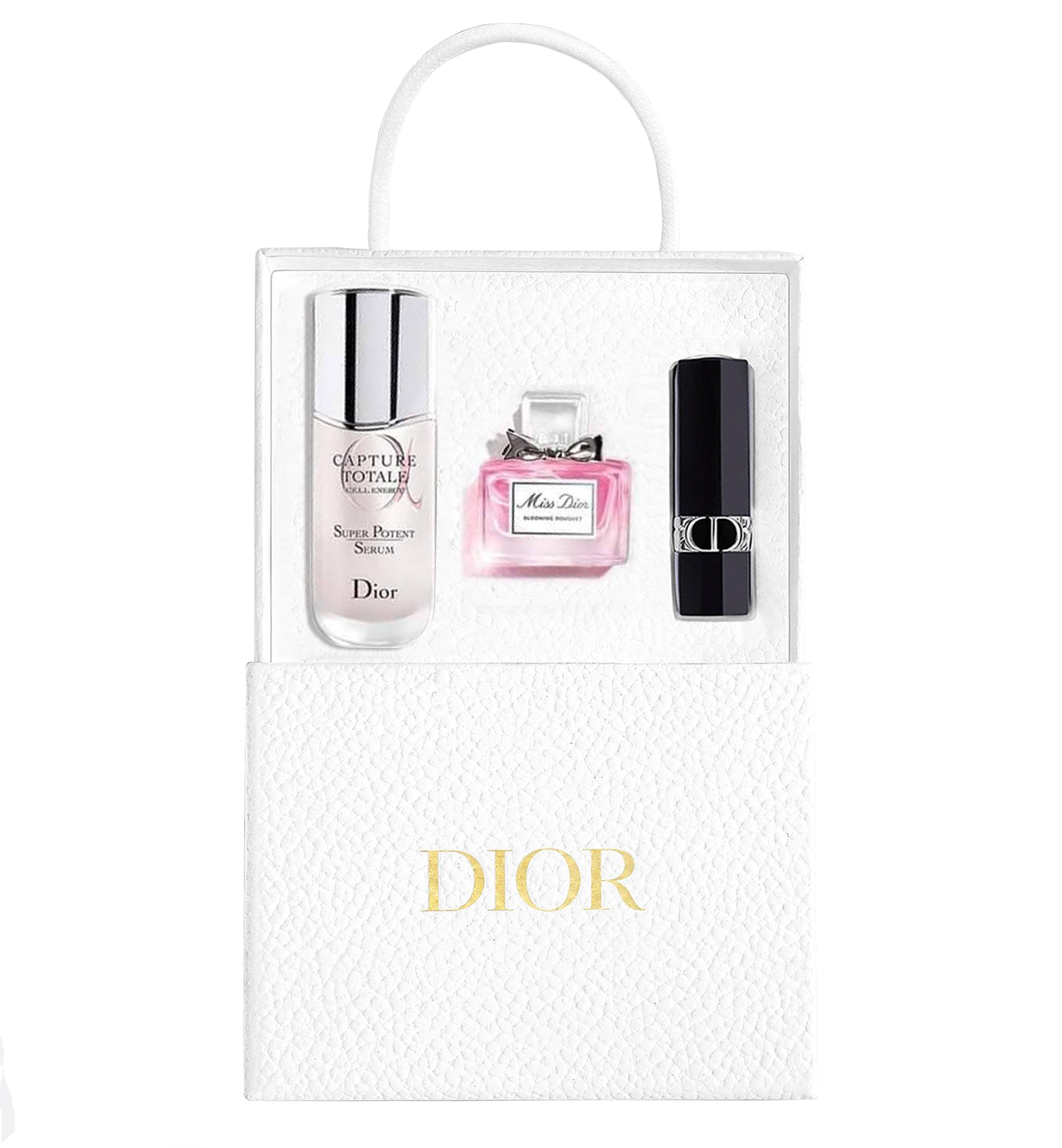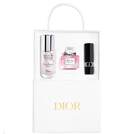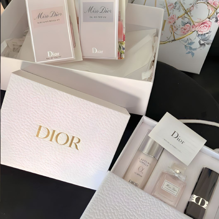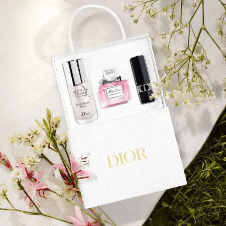 น้ำหอมที่มีกลิ่นหอมสดชื่นและกลิ่นดอกไม้ บรรจุอยู่ในน้ำหอมขนาดเดินทางที่ประดับด้วยโบว์ Miss Diorในตำนาน