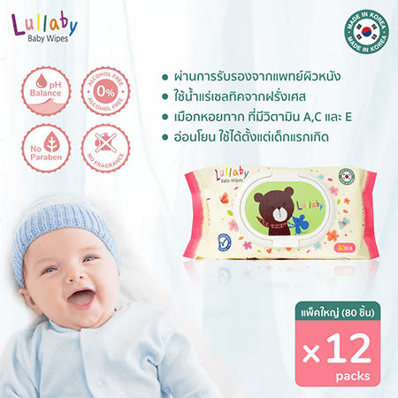 ซื้อ 1 ชิ้น ฟรี 1 ชิ้น !! Baby Wipes 80 Pcs ผ้าเปียก Lullaby ที่มีส่วนผสมจากน้ำแร่เซลทิคจากฝรั่งเศส ช่วยลดการระคายเคือง อ่อนโยนต่อผิว ใช้ได้ตั้งแต่แรกเกิดและทุกเพศทุกวัย