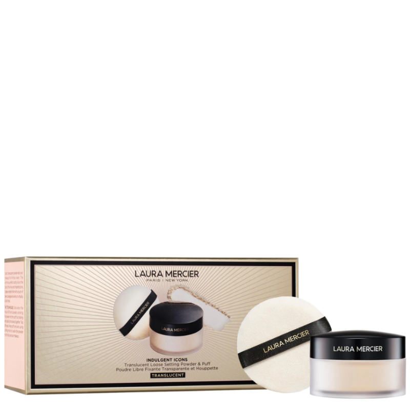 LAURA MERCIER Indulgent Icons Translucent Loose Powder 29g & Velour Puff Duo Gift Set เซตแป้งฝุ่นพร้อมพัฟขนาดใหญ่ เนื้อแป้งโปร่งแสง ไม่มีสี อณูละเอียด ช่วยกระจายแสง ให้ผิวดูเรียบ กระจ่างใส