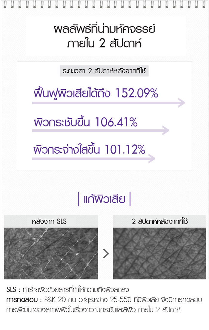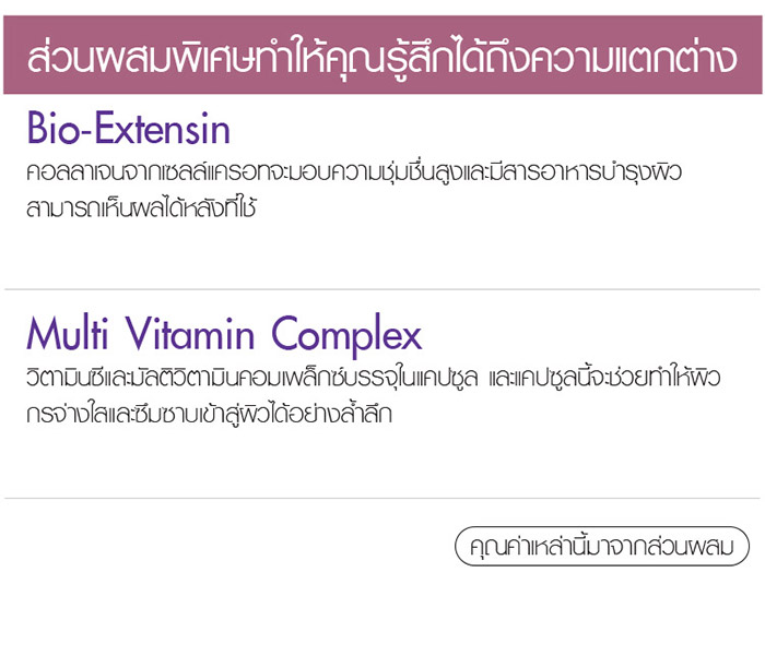 ผิวแลดูเปล่งปลั่งกว่าที่เคย ด้วยการผสมผสานการทํางานของยีสต์สกัดและ Provitamin ที่ลงตัวช่วยฟื้นฟูให้ผิวยืดหยุ่น ยับยั้งการเกิดริ้วรอยที่เกิดจากความแห้งกร้านของผิว